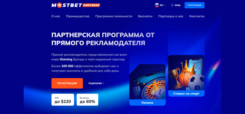 Mostbet Partners — официальная партнёрская программа букмекера и онлайн-казино Mostbet, работающая с 2016 года. Охватывает 50+ GEO с фокусом на Узбекистан, Азербайджан, Турцию, Индию и Казахстан — рынки с высокой конверсией и менее «отжатой» аудиторией, чем Россия. RevShare до 60%, CPA до $220, отсутствие carryover и рекордно короткий холд по CPA (1–2 дня).